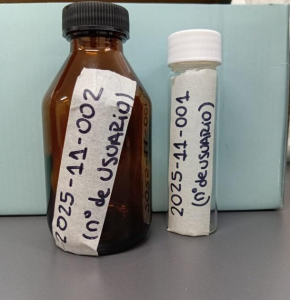 Figura 3: rotulado en envases de muestreo,  el rotulado se organiza con dos series de números: (1) Año-mes-número de servicio y (2) número usuario (se le asigna por única vez al inicio del contacto con el LAIE)